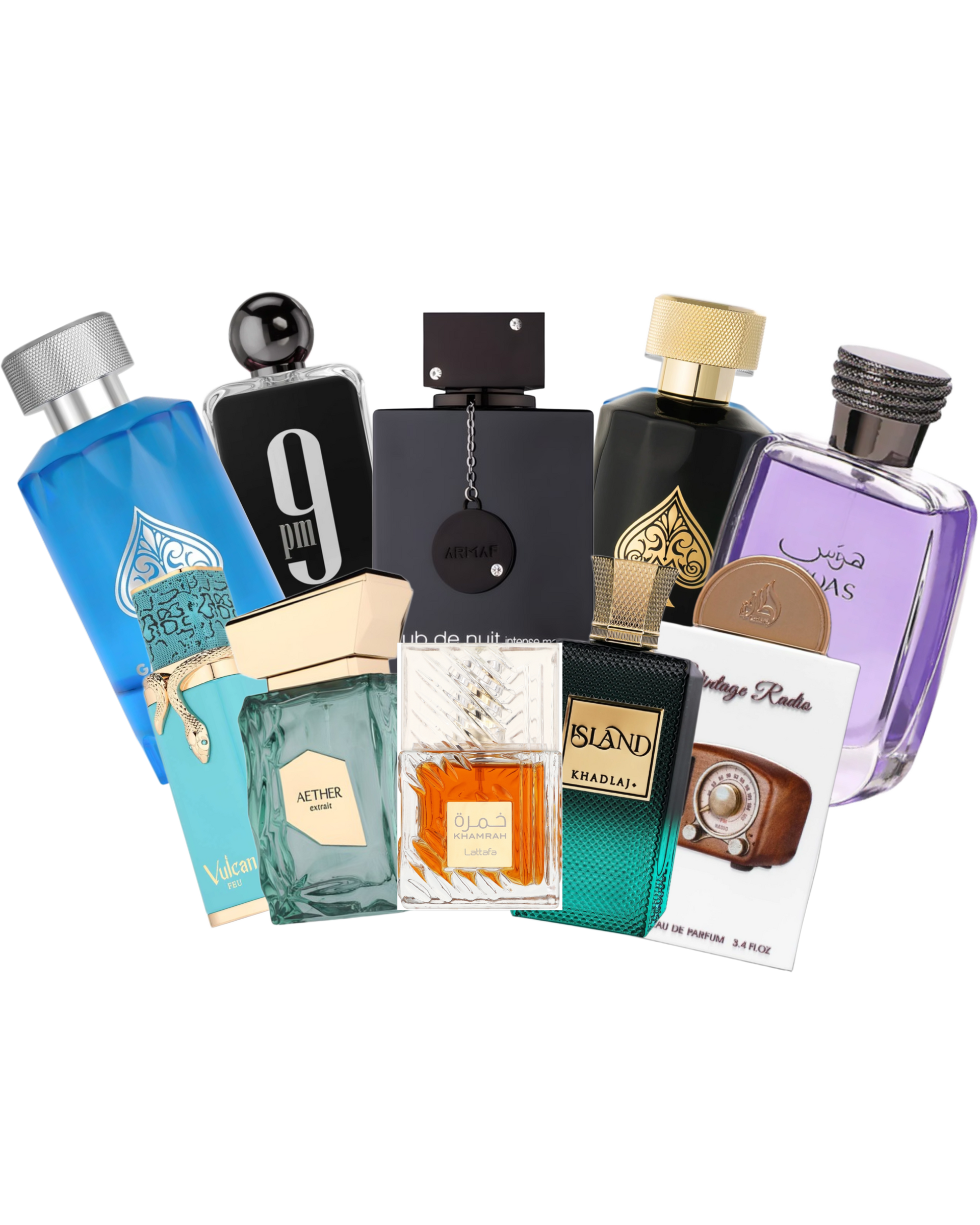 This product is a collection of rebottled samples of the original fragrances: Vulcan Feu, Aether Extrait, Khamrah, Khadlaj Island, Vintage Radio, Rasasi Hawas, Vintage Radio, Game of Spades Full House, 9 PM, and Game of Spades Wildcard.
